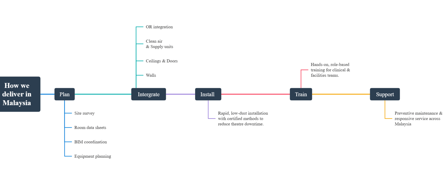 Malaysia-based project support, coordination with hospital estates teams, and alignment to local procurement/acceptance workflows.